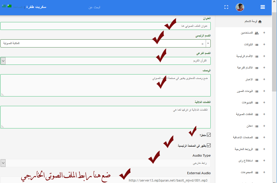 اليوم سوف نشرح لكم طريقة اضافة ملف صوتى الى محتوى موقعك فى قسم الصوتيات والشرح كما هو الصورة